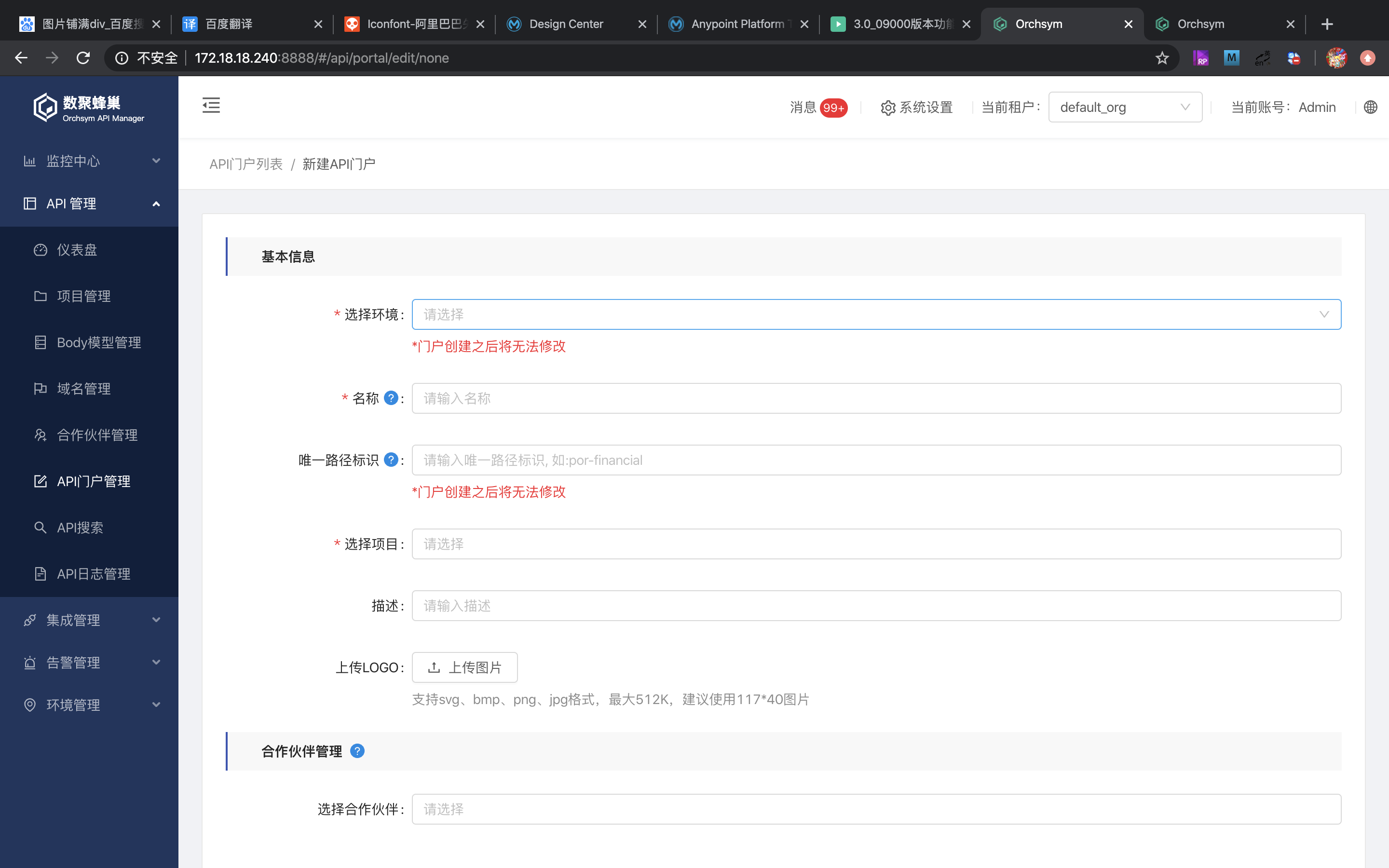 在项目中上线的API需要发布到API门户中,才可以开放给API消费者(合作伙伴)进行授权和调用。所以,首先要先在管理平台中创建API门户。