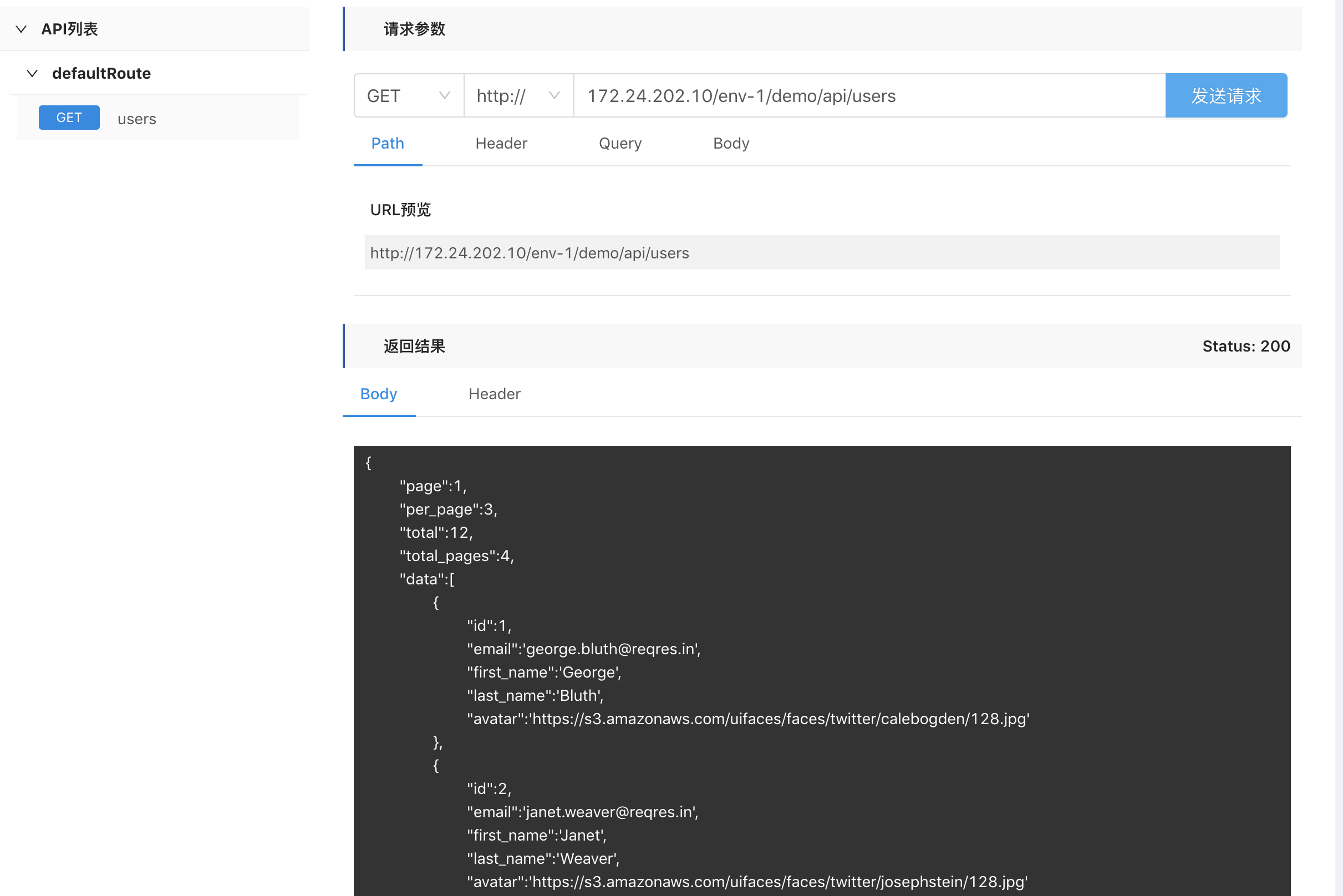 首先,我们先尝试调用一个之前已经注册过的api。从测试的返回结果我们可以看到,他的返回值是 JSON 格式的。