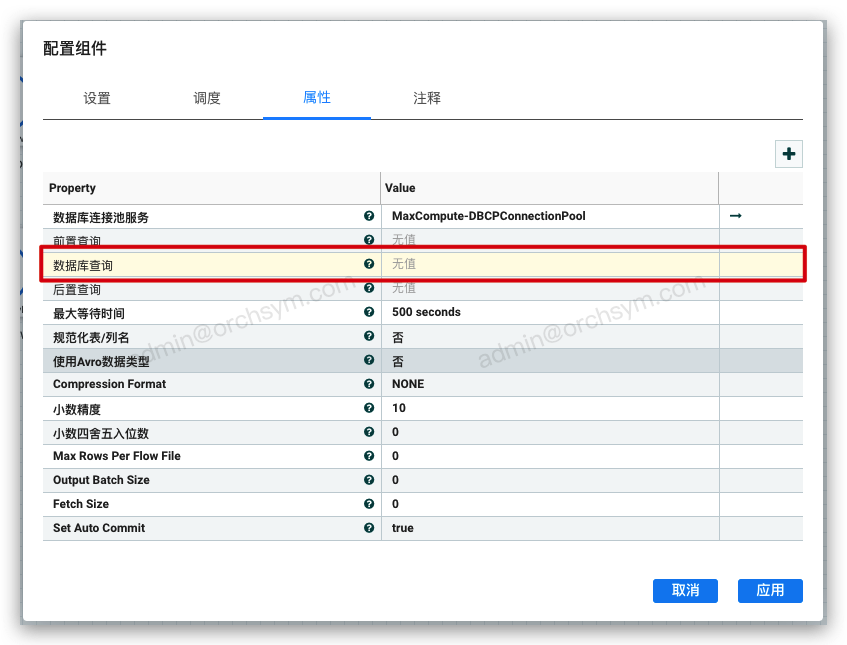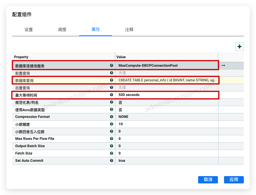 组件配置要执行的SQL语句,然后创建DBCPConnectionPool
