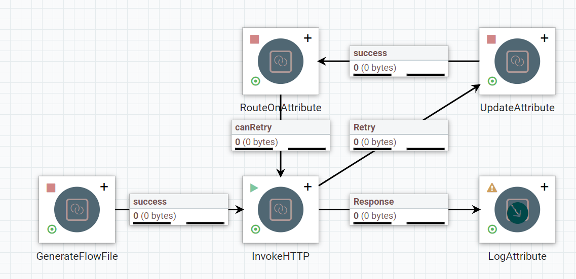 - 配置一个变量 retryTimes变量,初始化为 0 。如果不具备动态增加属性的情况,可以在重试组件的前面增加updateAttribute组件,在它上面增加属性。