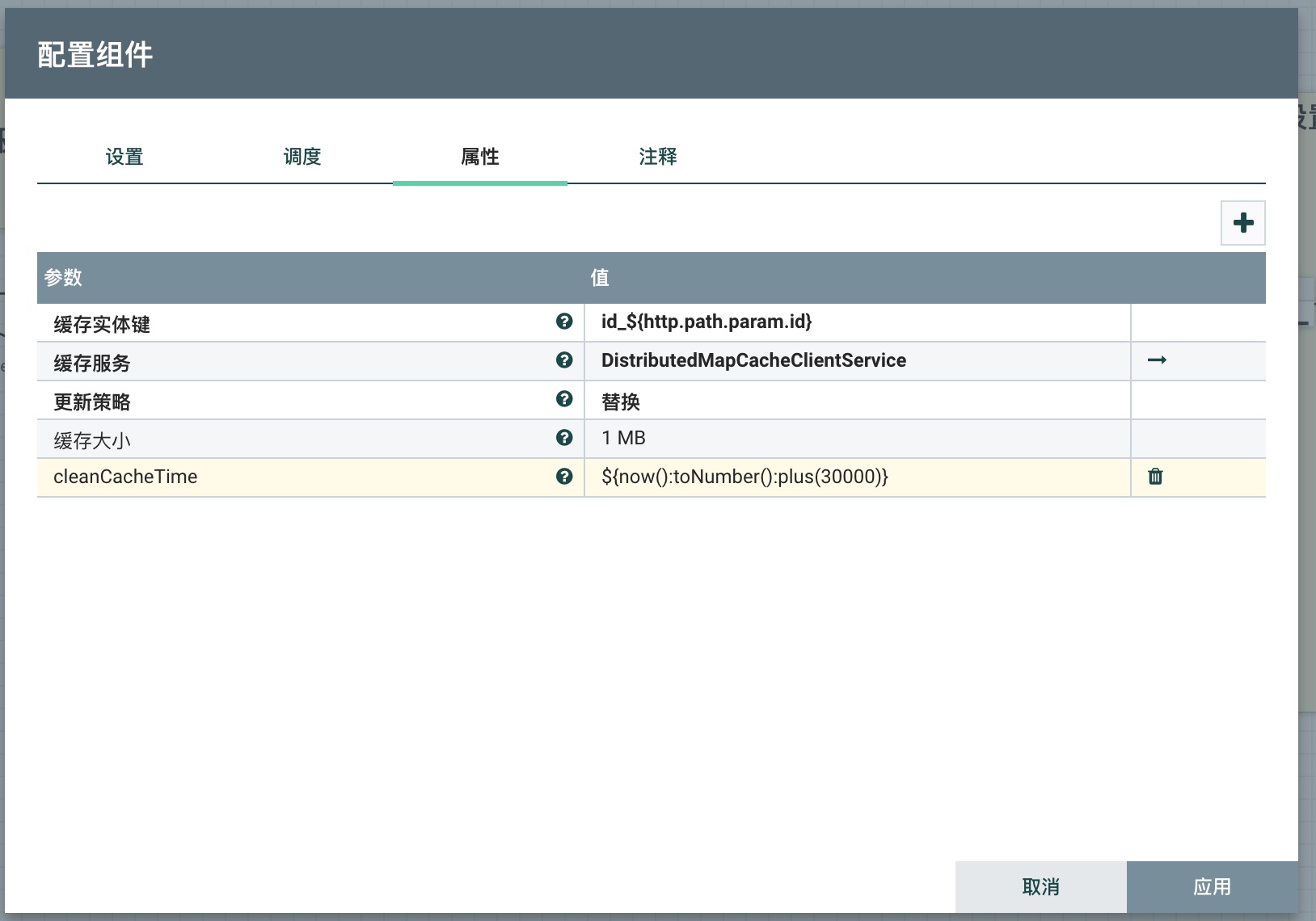 - cleanCacheTime:该属性是新增的自定义属性,通过该属性记录删除缓存的时间,也即是缓存的有效时间,本流程中设置为30s
