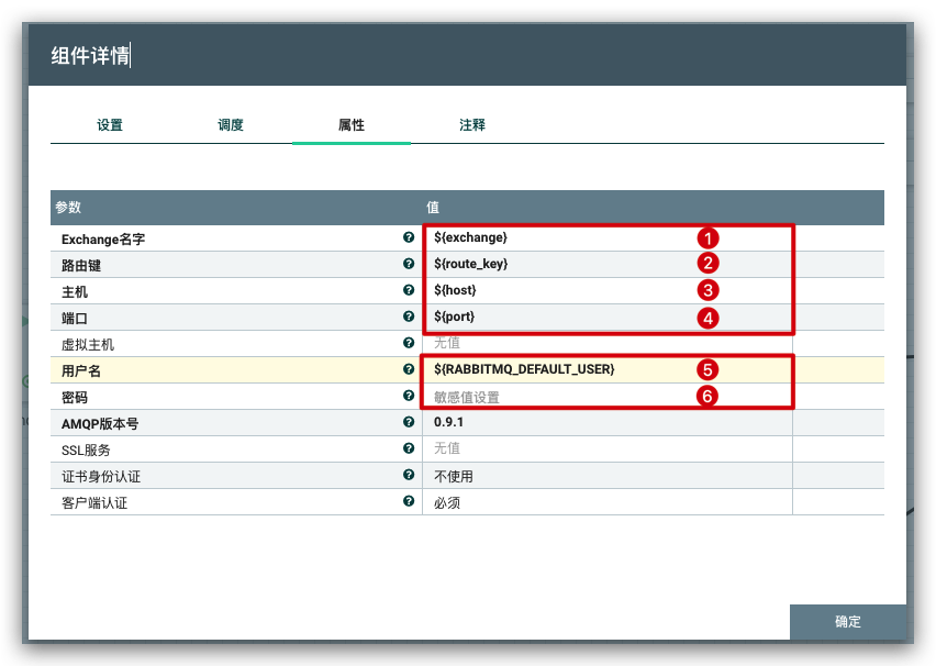 - 默认需要配置 host、port、queue 和 用户认证相关信息