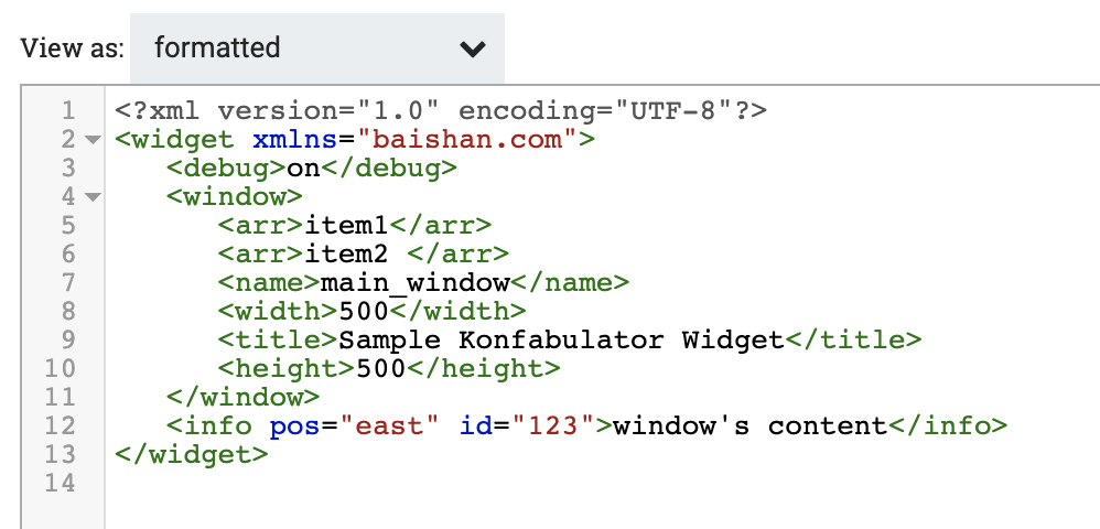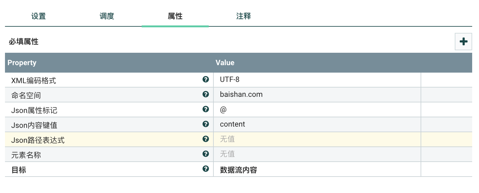 将样本数据1中info的@id和@pos字段当作xml的属性值,"content"内容作为xml元素值,同时指定命名空间为"baishan.com",ConvertJSONToXML配置如下: