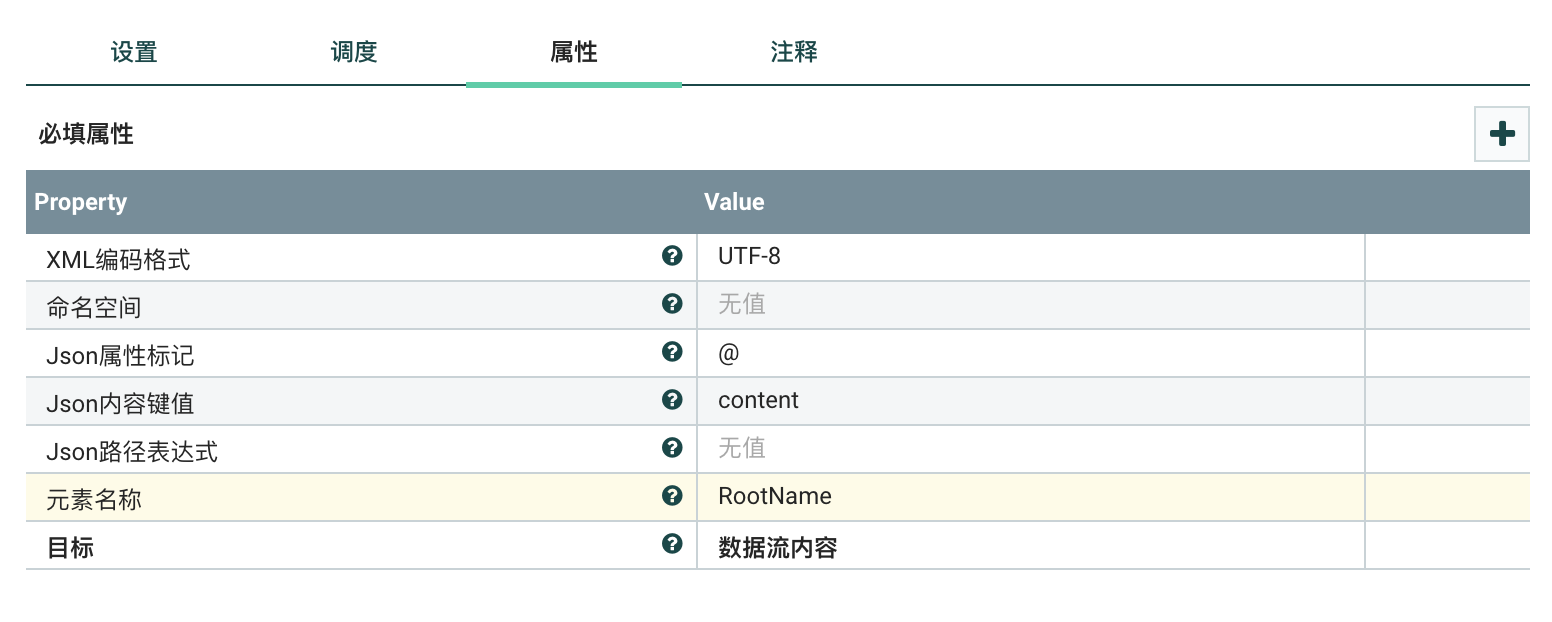 假设样本数据如上,如果的将上面内容转换成xml,转换的结果由于没有根结点,不是正确格式的XML内容。因此需要指定Element Name (元素名称),假定我们指定值为“RootName”配置如下: