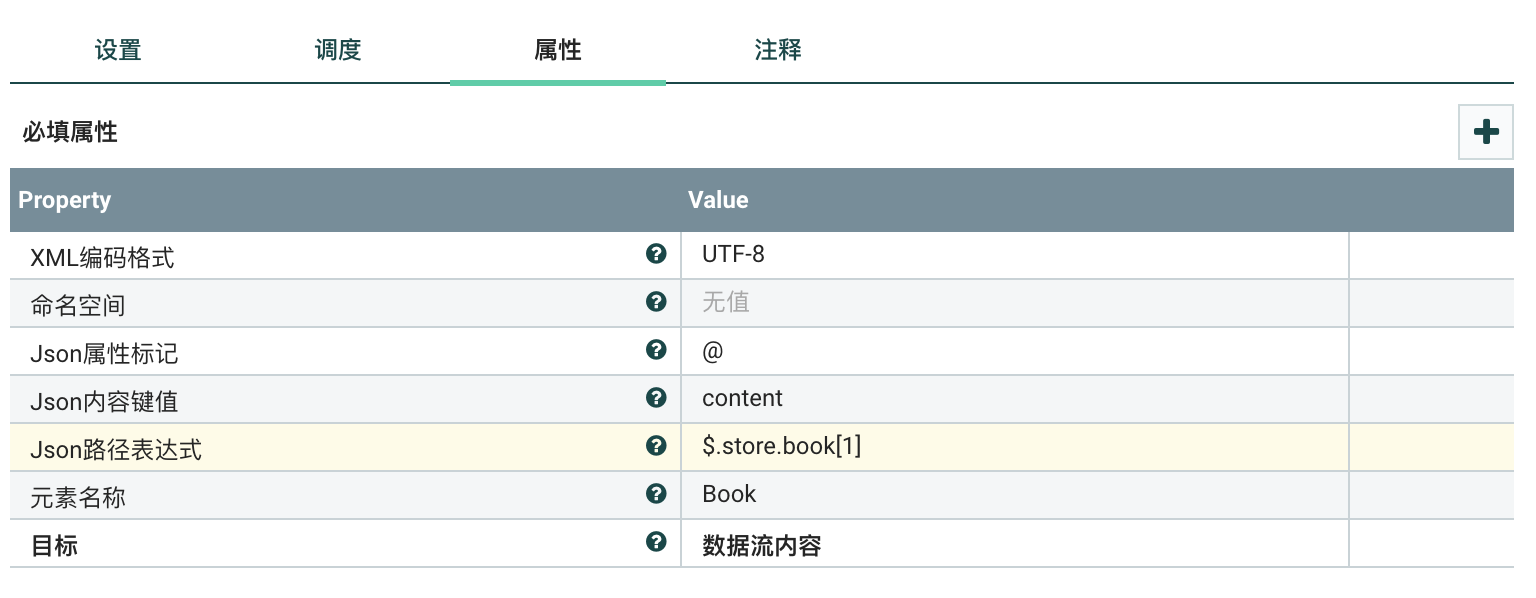 我们指定Json路径表达式为:$.store.book[1],提取json数据中的第2个book json对象,同时指定元素名称为Book,配置如下: