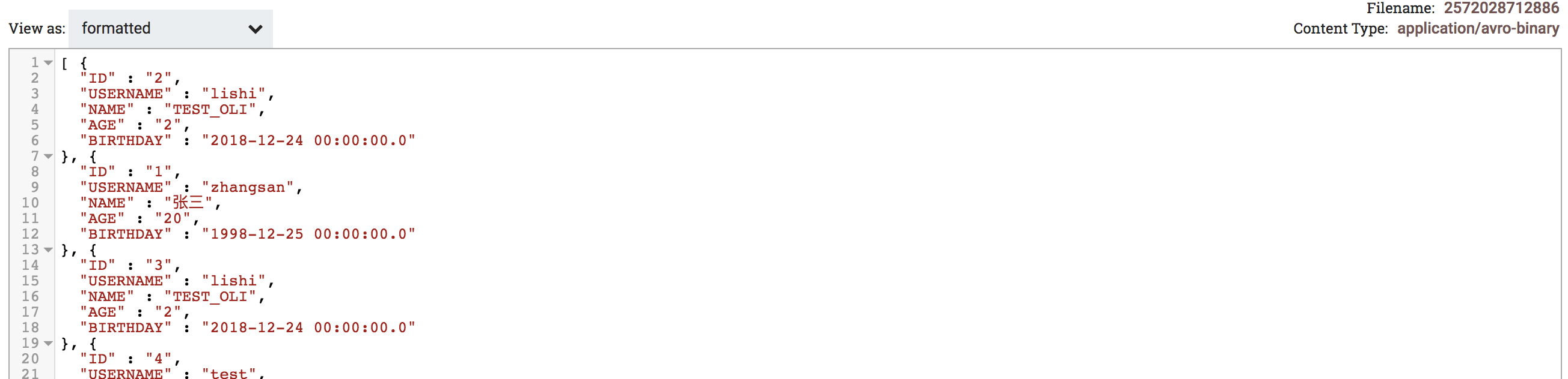 通过配置数据库连接池并指定SQL语句来查询出结果,其输出结果为Avro格式,由于带有数据库表的元数据信息。