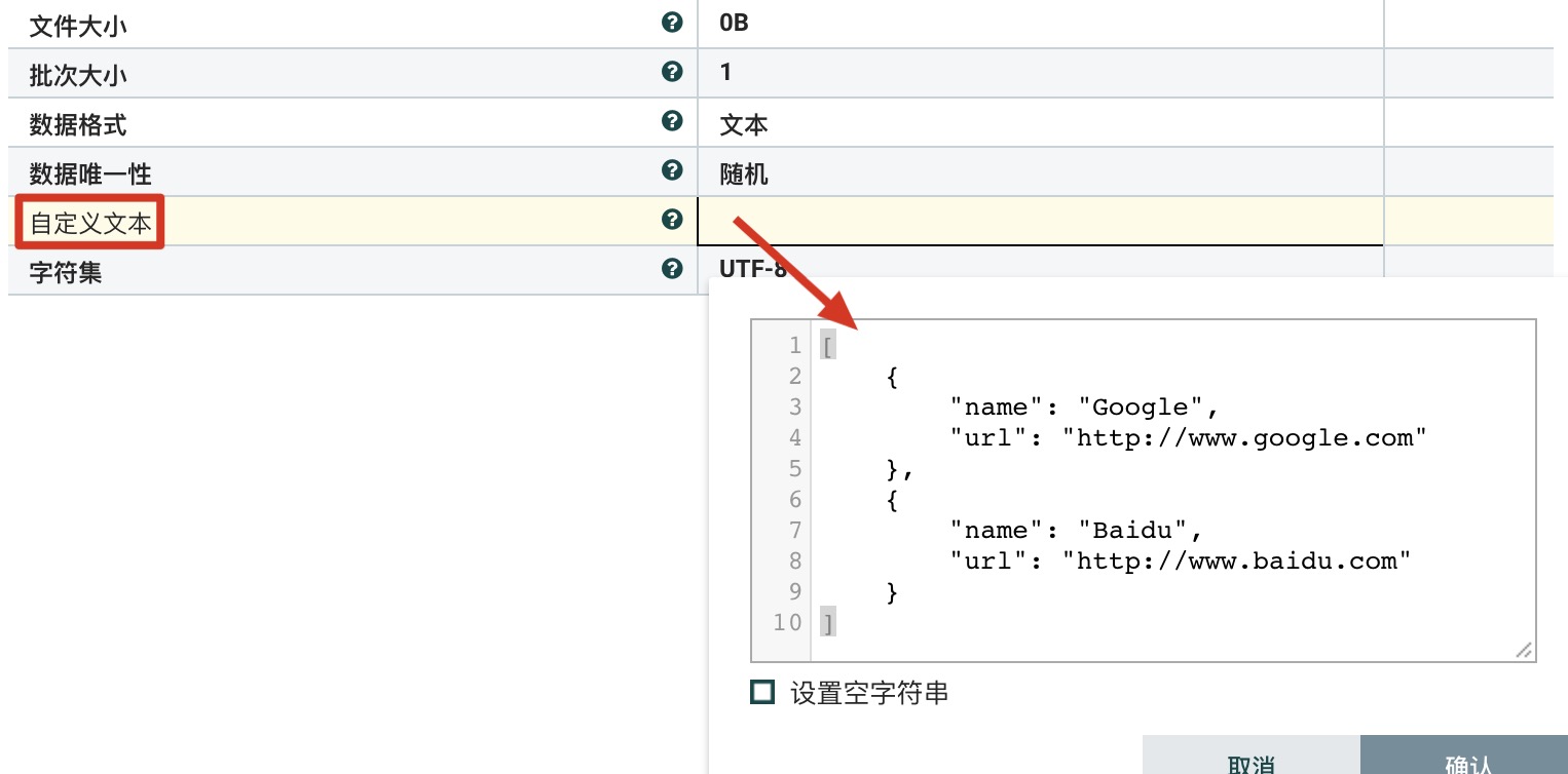 生成,且通过配置"自定义文本"参数的内容与上面输入数据相同的JSON数组数据。注意:切记将该组件“调度”下的“运行安排”设置大些,否则将瞬间生成大量测试数据。
