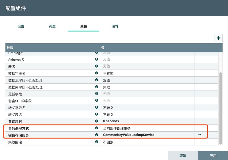 - 如果选择使用下游组件处理事务时,则必须配置并开启后续事务处理组件,否则会产生数据库事务积压,严重影响数据库库性能。并且已成功处理数据可能会因为未提交事务而导致数据丢失(数据库连接超时关闭时会自动回滚事务)